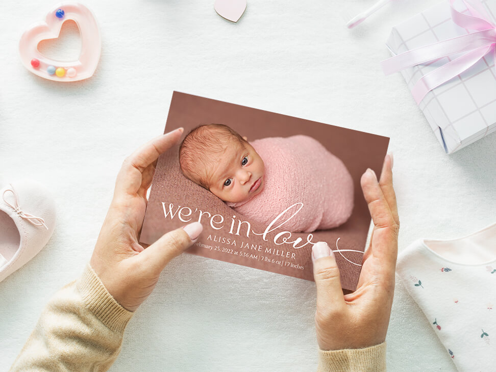 Find everything you need to share your big news, from glitzy wedding invitations to festive holiday cards to simple thank you notes. Add photos and text to a custom template, or upload and print your own finished design.